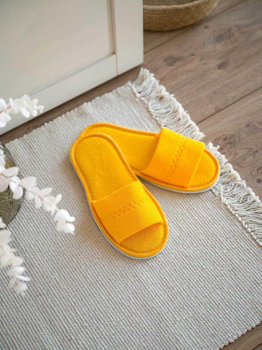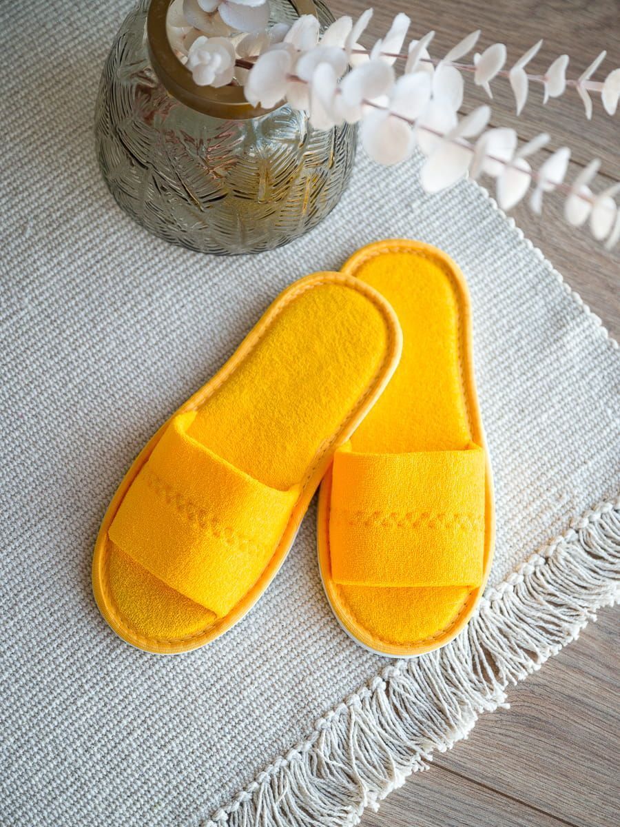 Тапочки желтые с открытым мысом изготовлены из качественной натуральной махровой ткани с толстой подошвой. Рекомендованы к использованию в СПА-центрах, массажных салонах и гостиницах для удобства и комфорта клиентов.