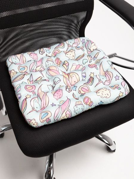 Подушка на стул в красочном дизайне создана специально для детей, преимущественно школьного возраста, так как при выполнении домашних заданий им сложно сохранять правильную осанку. Наполнитель из лузги гречихи обладает ортопедическими свойствами и придает подушке необходимую жесткость. Такая подушка за счет своей формы и особенностей наполнителя очень полезна для правильного развития опорно-двигательного аппарата, хорошего кровообращения при долгом сидении.