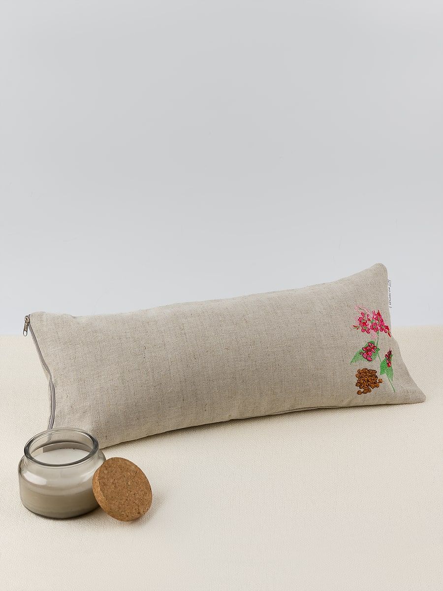 Ткань чехла – натуральный неокрашенный лён с вышивкой. Застежка-молния позволяет регулировать объем наполнителя в подушке по своему вкусу и адаптировать ее под особенности строения любого человека.