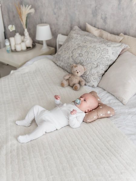 МАЛЮТКА – это удобная и полезная подушечка для самых маленьких детишек. Необычная форма в виде бабочки помогает держать головку на подушечке во время сна или бодрствования и поддерживает шею, обеспечивая правильное развитие.